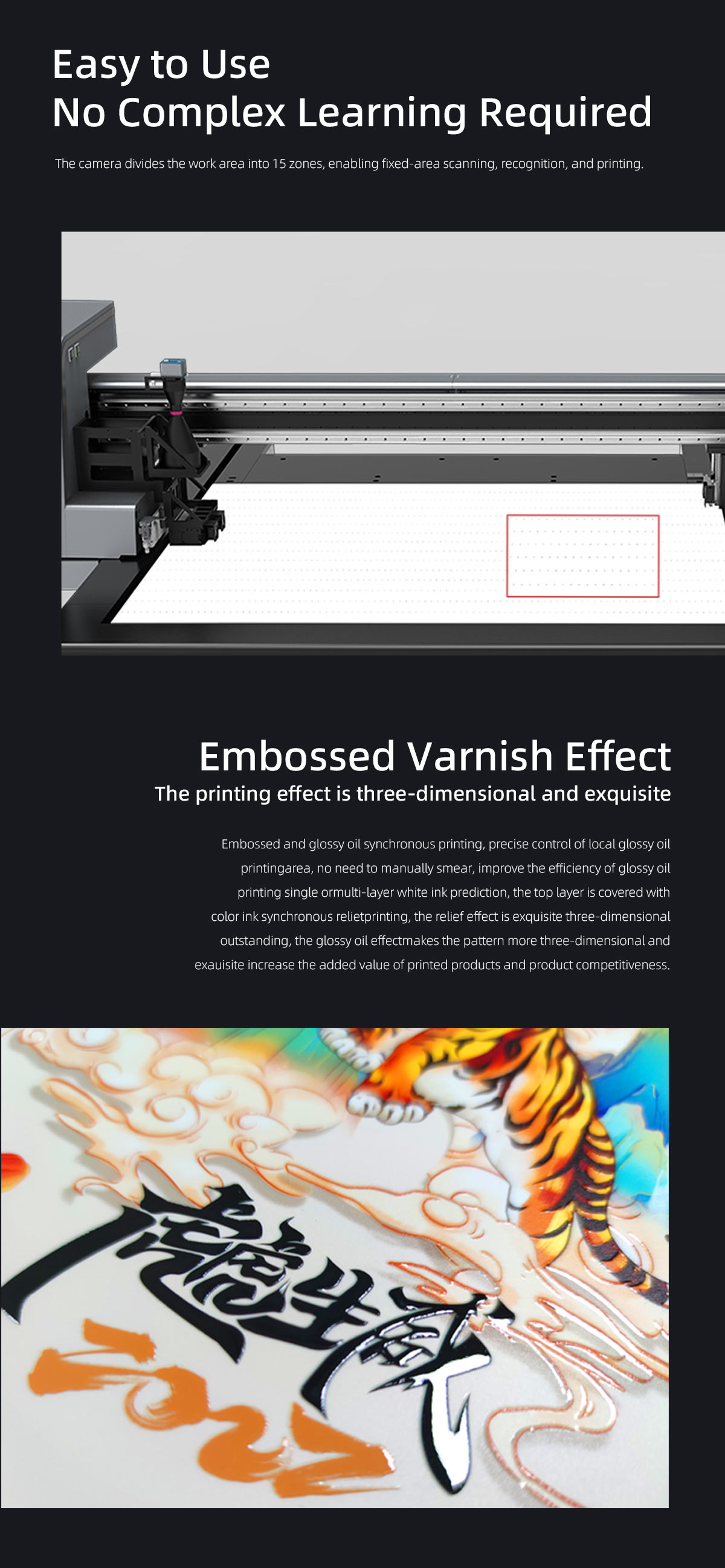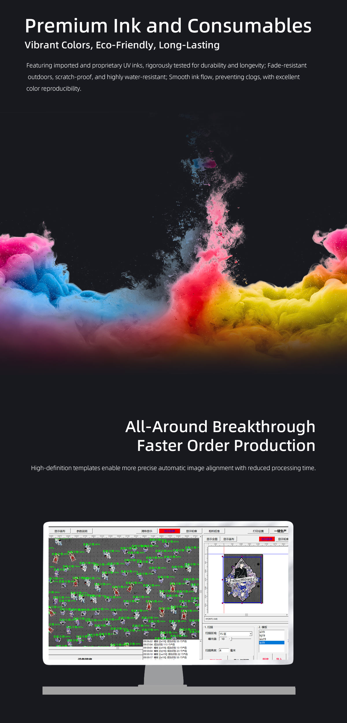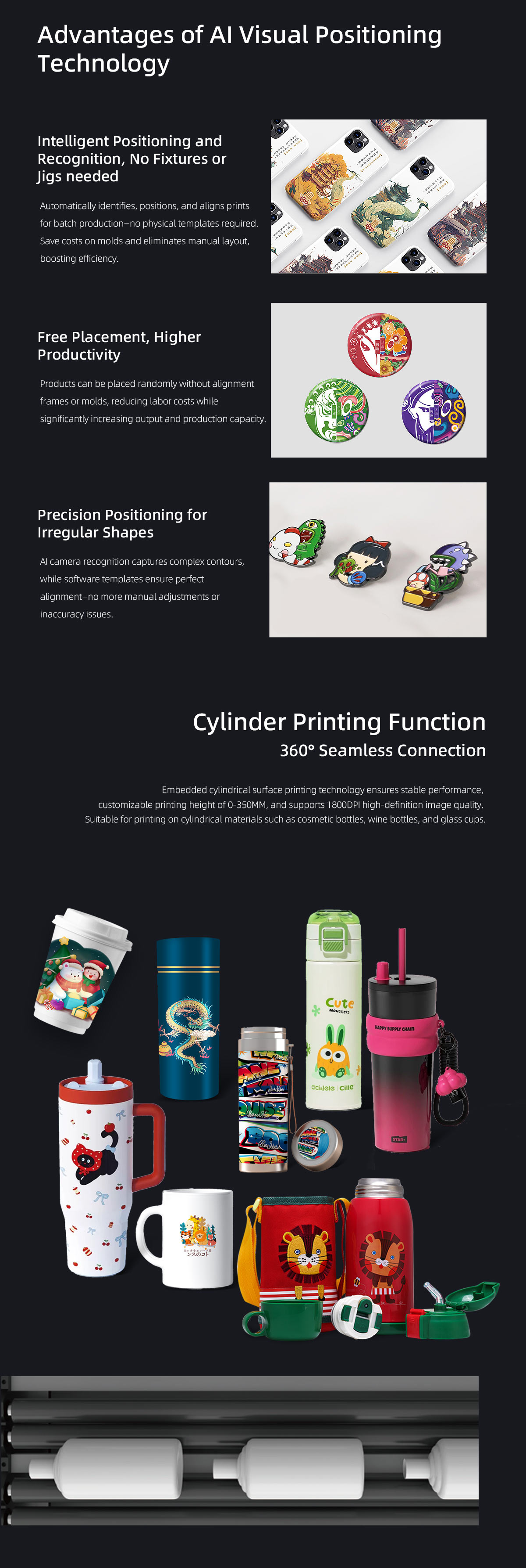 Product description:Product description:Vision positioning UV printers eliminate the need for printing positioning frames, solving the challenges of positioning various irregularly shaped materials. T···