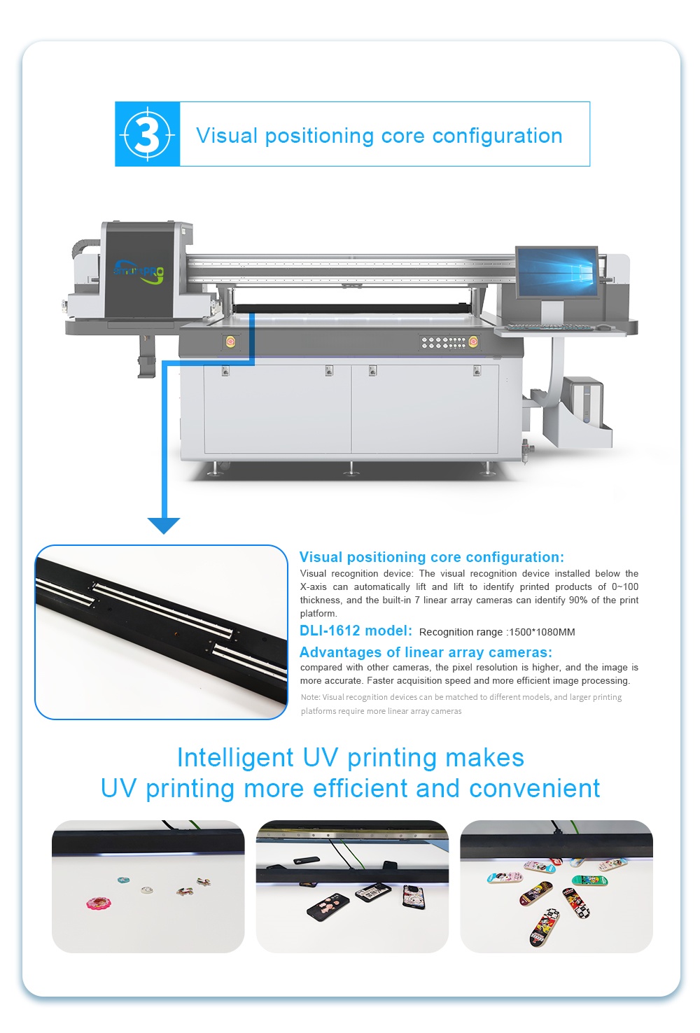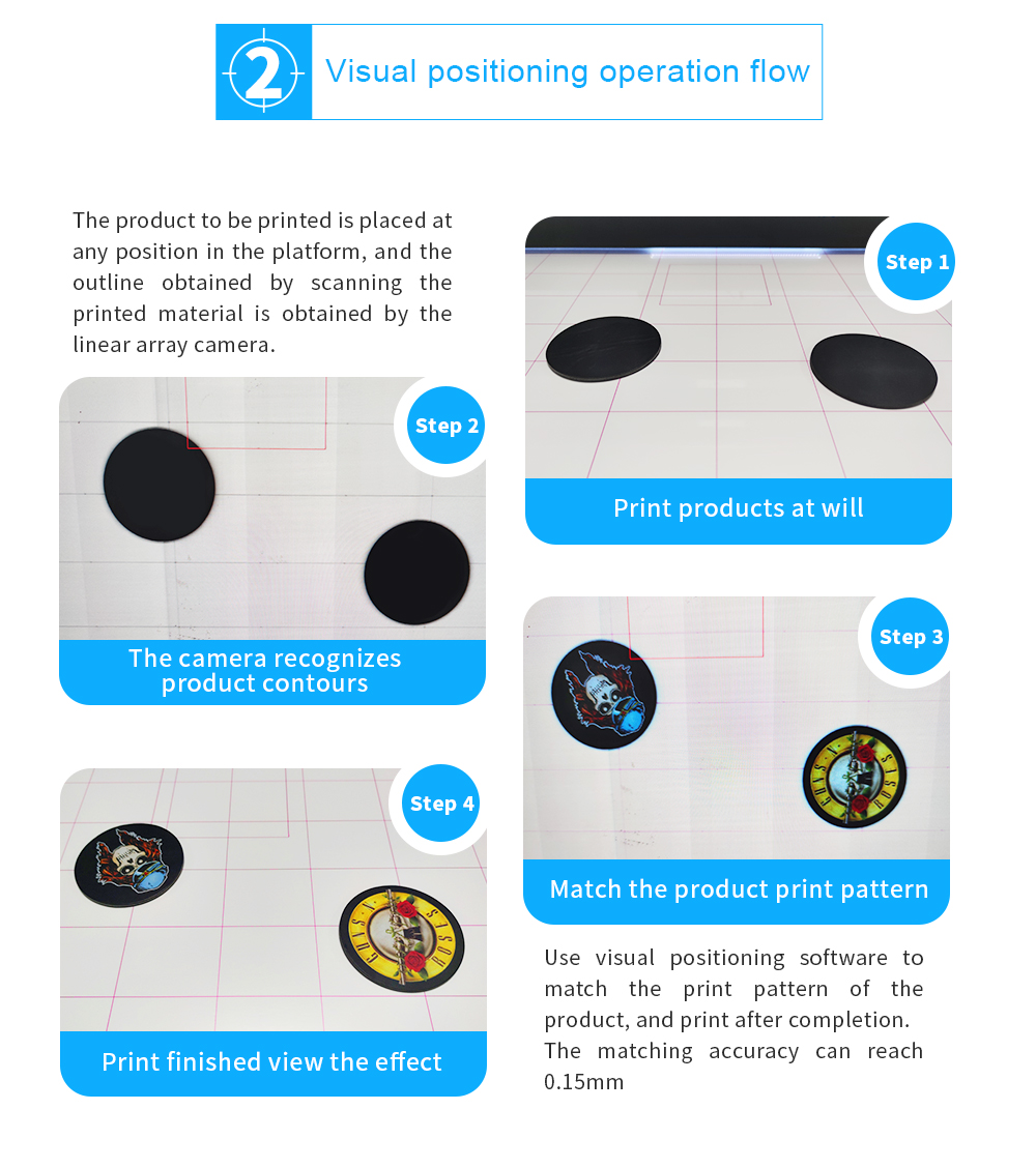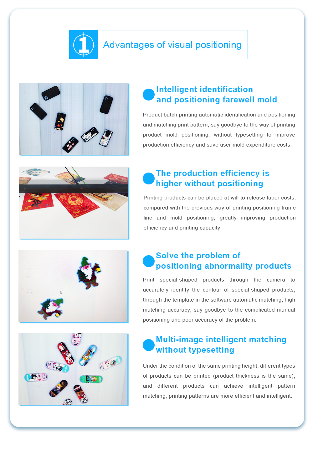 Product description:Product description:Vision positioning UV printers eliminate the need for printing positioning frames, solving the challenges of positioning various irregularly shaped materials. T···